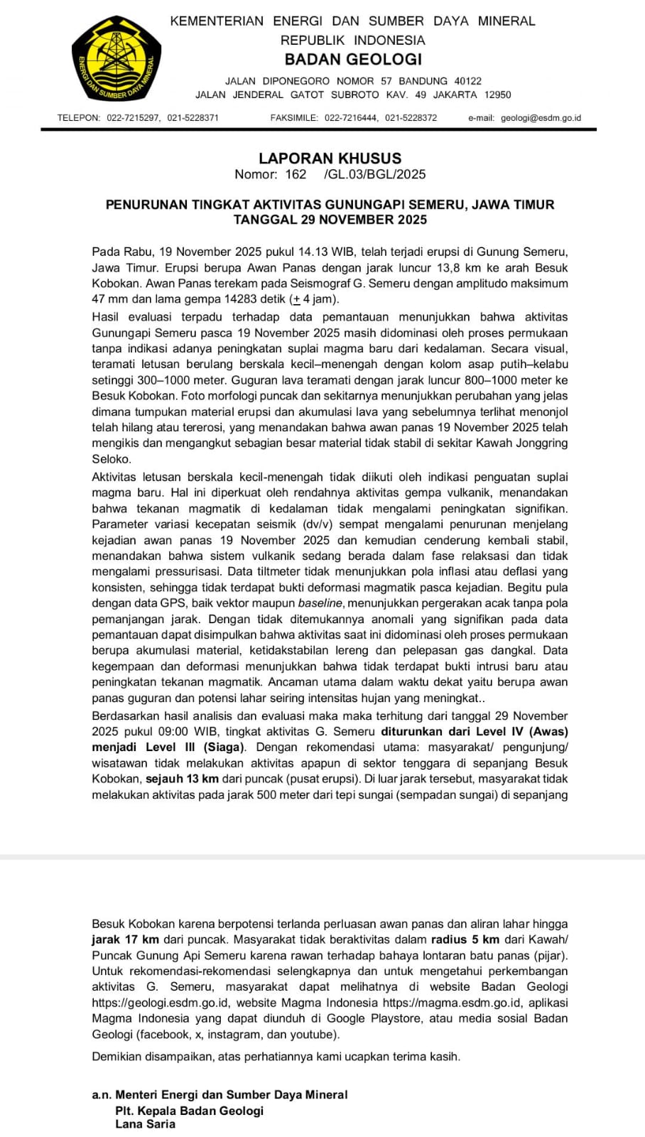 Ya, ada penurunan status tadi di grup Whatsapp G.Semeru di share kata Cak Sul Sekretaris Desa Sumberwuluh menyampaikan,Indikasi Penurunan Tekanan Magmatik, Hasil analisis menunjukkan bahwa aktivitas Gunung Semeru pasca 19 November 2025 didominasi oleh proses permukaan dan tidak menunjukkan indikasi adanya peningkatan suplai magma baru dari kedalaman.