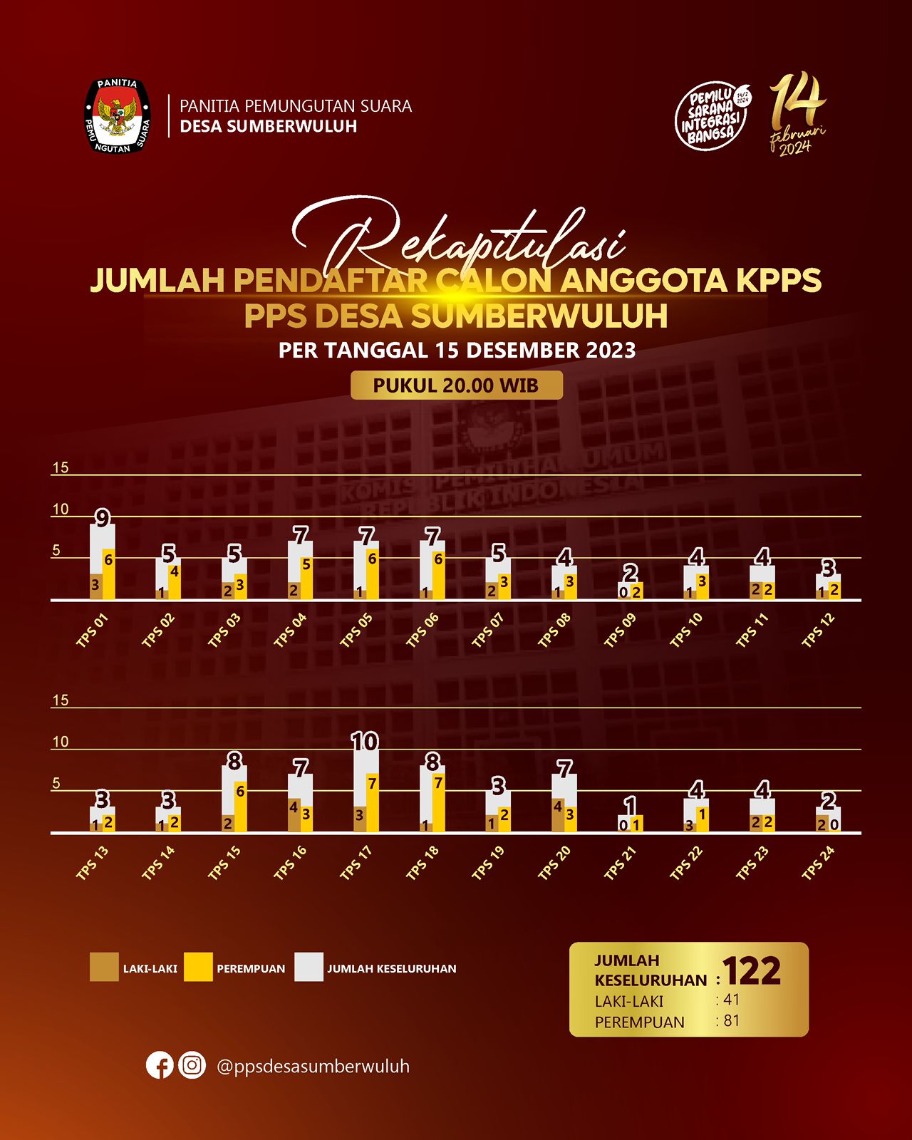 Rekap sementara untuk pendaftaran KPPS , jumlah pendaftar calon anggota KPPS PPS Desa Sumberwuluh Kecamatan Candipuro pertanggal 15 Desember 2023 pukul 20.00 WIB ...
