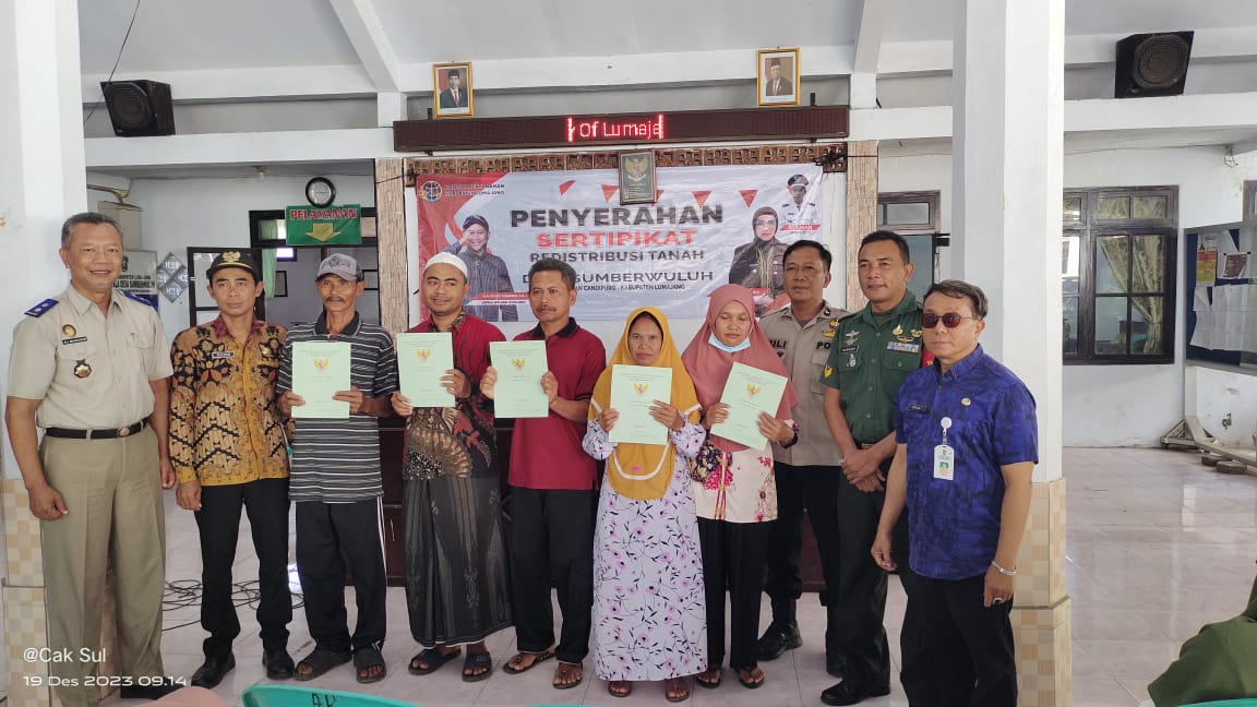 Pembagian Sertifikat Redistribusi Tanah Desa Sumberwuluh Kecamatan Candipuro Sejumlah 150 Pada hari Selasa, 19 Desember 2023, bertempat di Balai Desa Sumberwuluh, Kecamatan Candipuro, Kabupaten ...